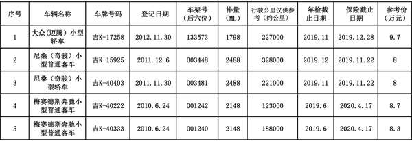 吉林省天池拍賣有限責(zé)任公司受長白山旅游股份有限公司的委托,對以下5臺公務(wù)用車進(jìn)行公開拍賣: