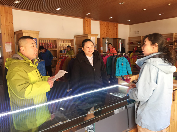 活動中支委班子成員及相關(guān)人員來到北景區(qū)人員密集場所,以匿名問卷調(diào)查形式,對景區(qū)內(nèi)是否存在,欺行霸市、欺客瞞客、不明碼標價、誘導(dǎo)消費、擾亂景區(qū)秩序現(xiàn)象,進行摸排。隨后來到景區(qū)各經(jīng)營網(wǎng)點走訪并就掃黑除惡斗爭的政策、內(nèi)容及舉報方式、舉報渠道,向經(jīng)營商戶進行講解,希望商戶們能以掃黑除惡專項活動為契機,為維護長白山旅游品牌形象,打造一個優(yōu)質(zhì)的營商環(huán)境共同努力。