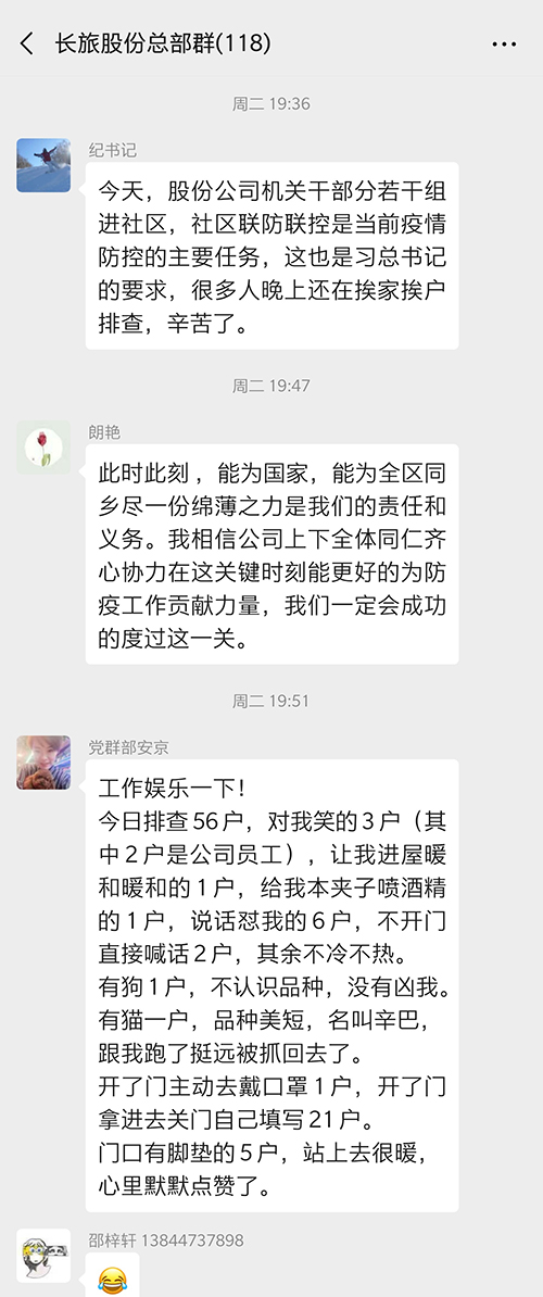 下班后,為了緩解疲勞,打氣加油,相互之間還在工作群內(nèi)開起玩笑,幽默的總結(jié)一天的工作情況,伴著僅有的一點歡樂和一天的疲憊憨憨入睡,養(yǎng)足精神繼續(xù)投身第二天的工作中,用實際行動兌現(xiàn)“疫情不除,我們不退”的莊重誓言。