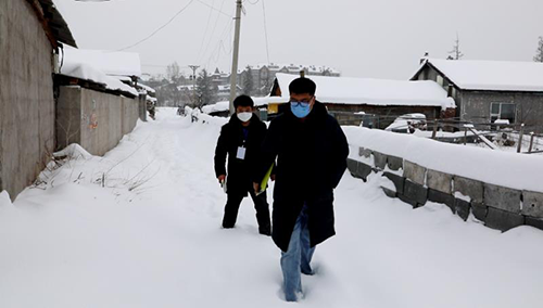 2月17日,長白山地區(qū)迎來了入冬以來規(guī)模最大的一場(chǎng)大雪,這為第二天的排查工作增添了不小困難。清早,雪花還沒有停止,漫天白雪里,我們依然聽到了“咯吱咯吱”的踩雪聲,原來股份公司的志愿者一早就已經(jīng)趟著膝蓋深的積雪,來到指定區(qū)域進(jìn)行入戶排查登記。天寒地凍、大雪紛飛,雪水濕透了襪子,寒風(fēng)刺痛著臉頰,也不能阻擋股份人和全區(qū)人民一道戰(zhàn)勝疫情的信念和決心。